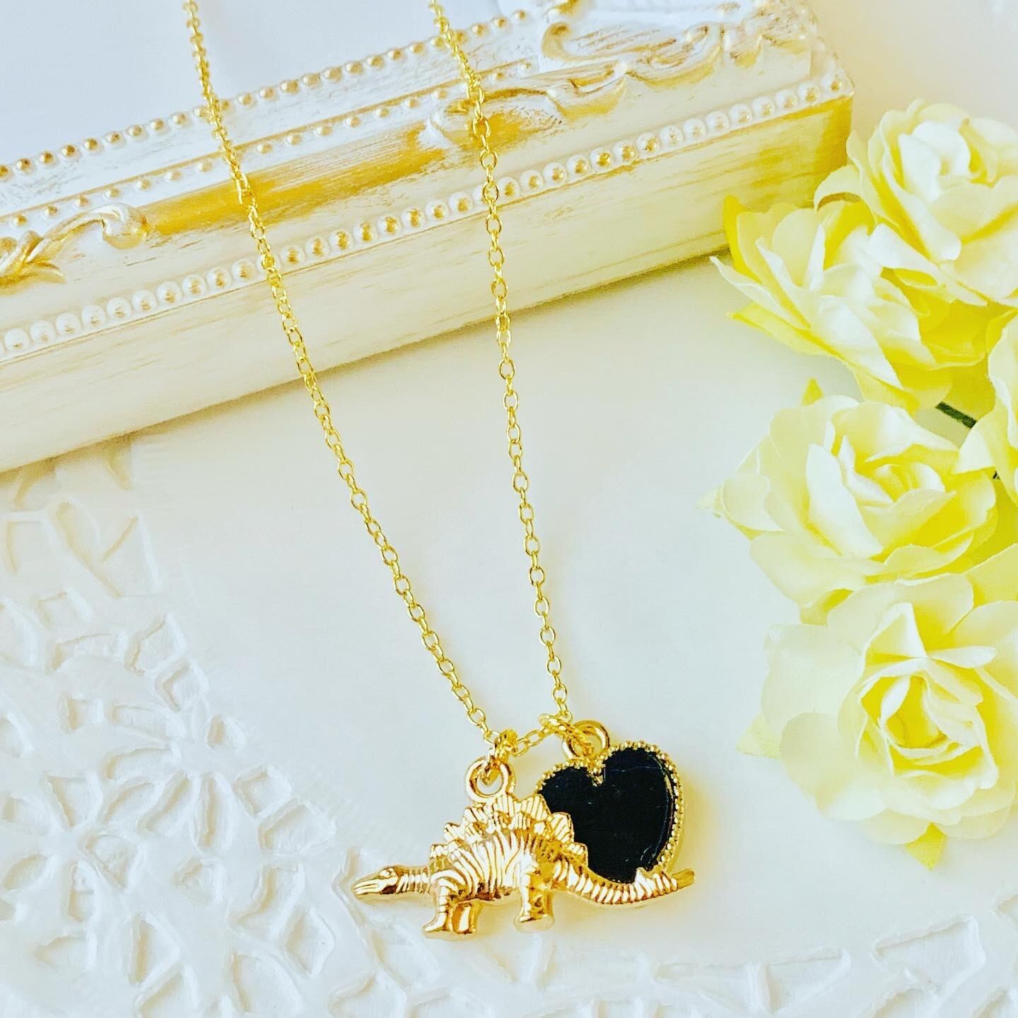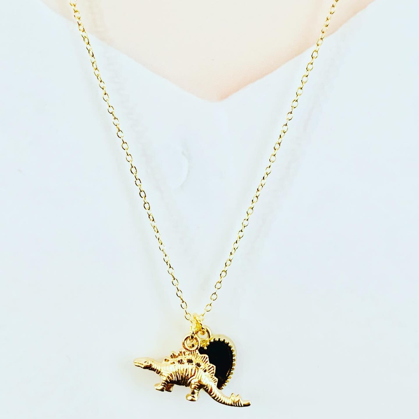 ハートチャーム付恐竜(ステゴザウルス)ネックレスです。カラーはゴールド。