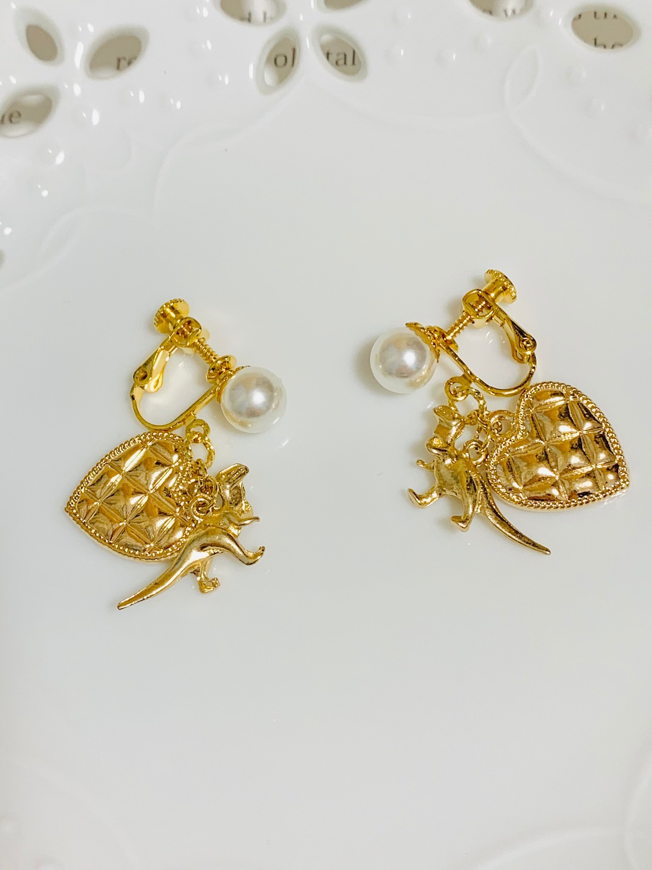 パール付き 恐竜&ハートイヤリング