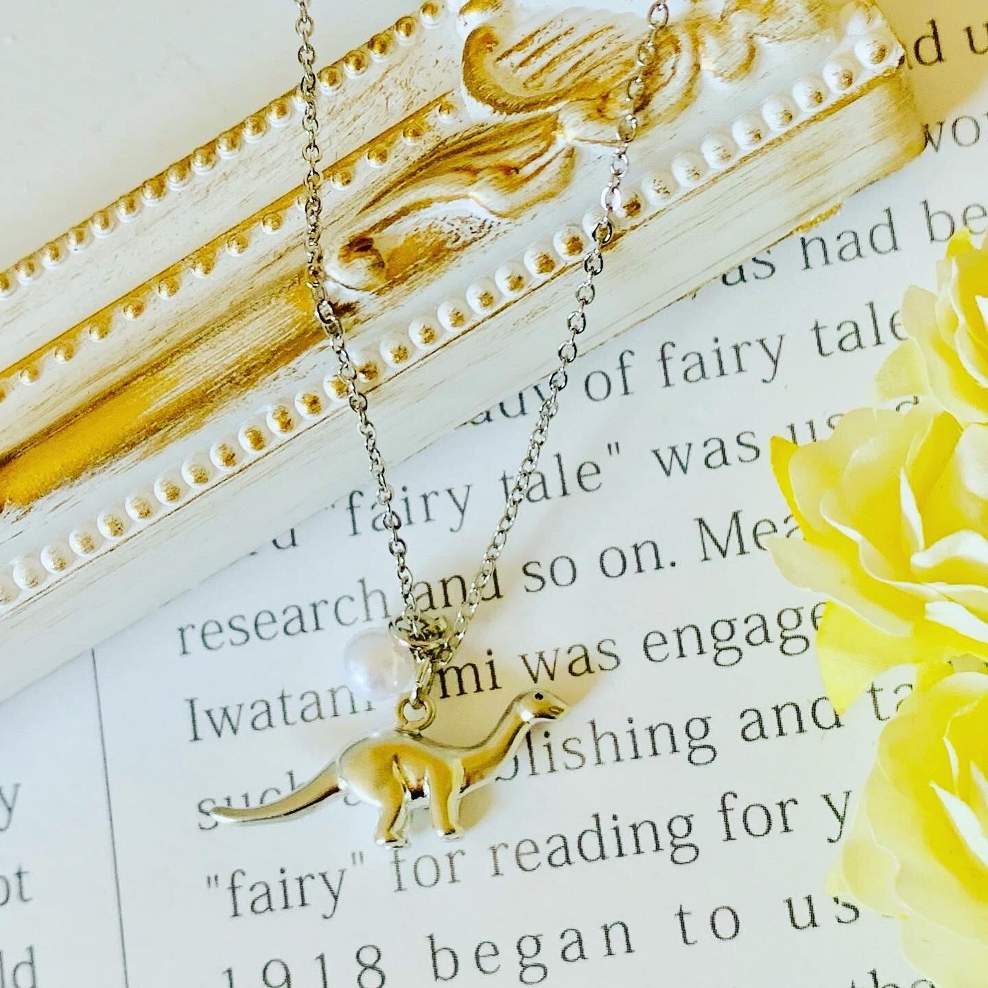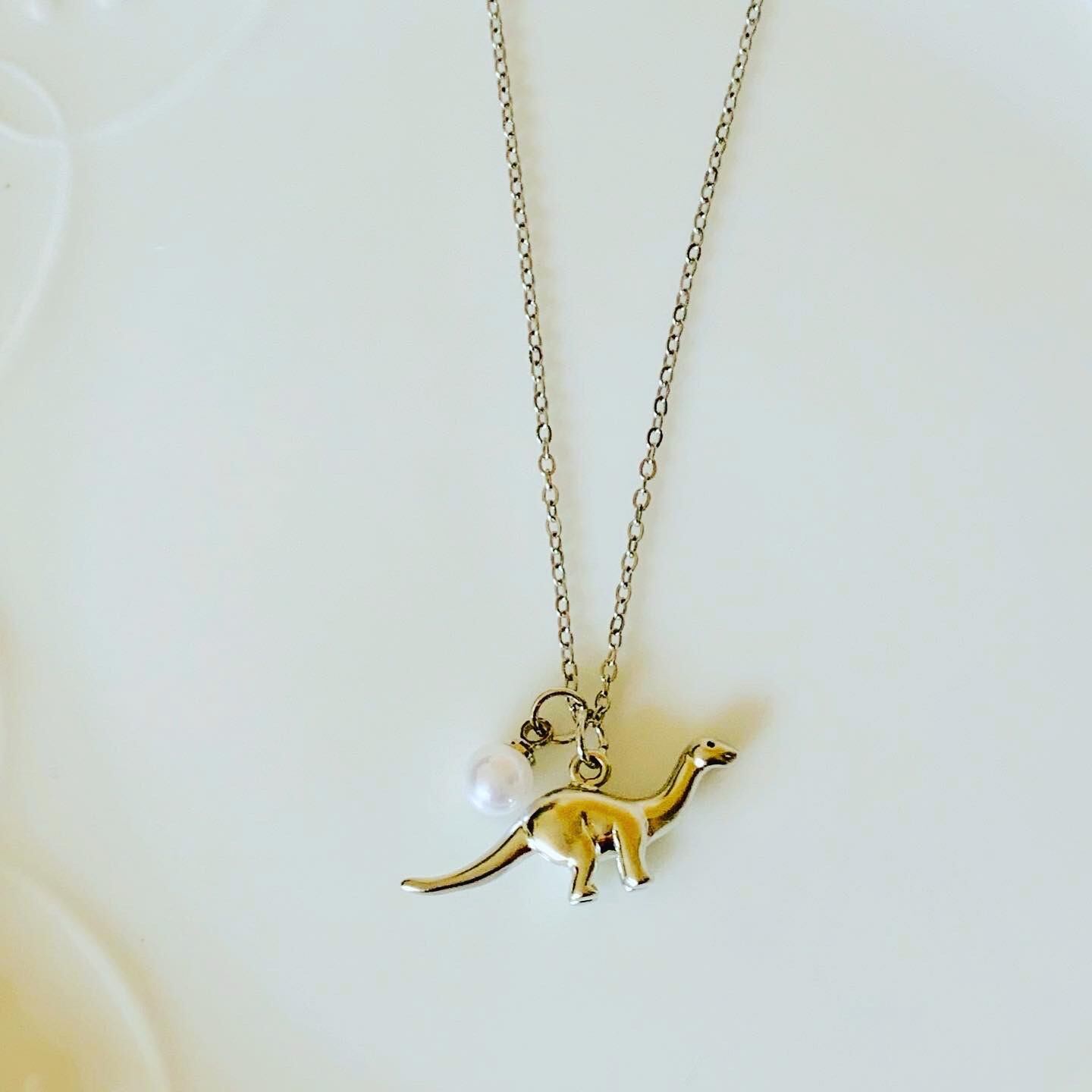 パール付き 恐竜ネックレス (ステンレスチェーン)