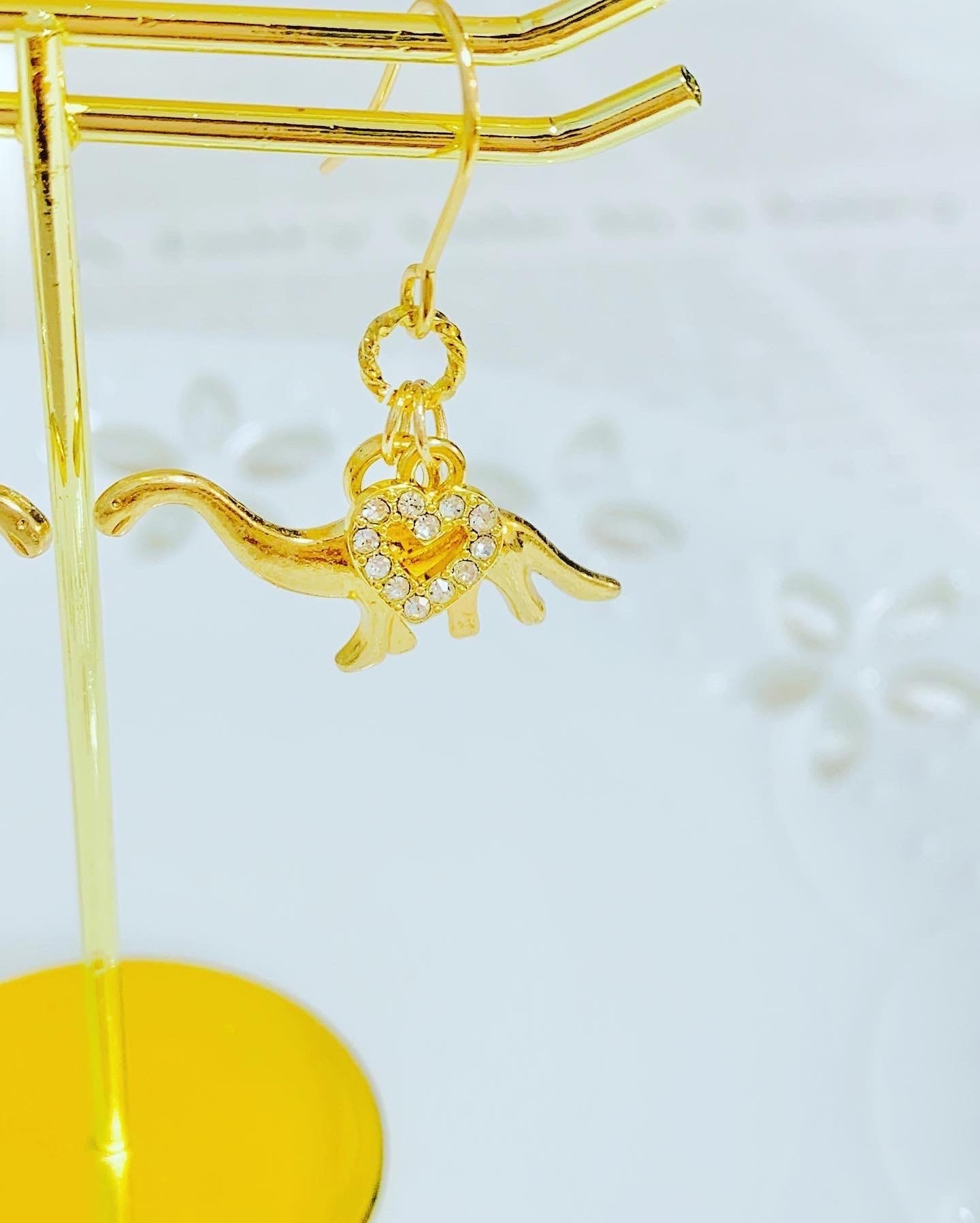 ハート型ラインストーン付きの恐竜ピアスです。