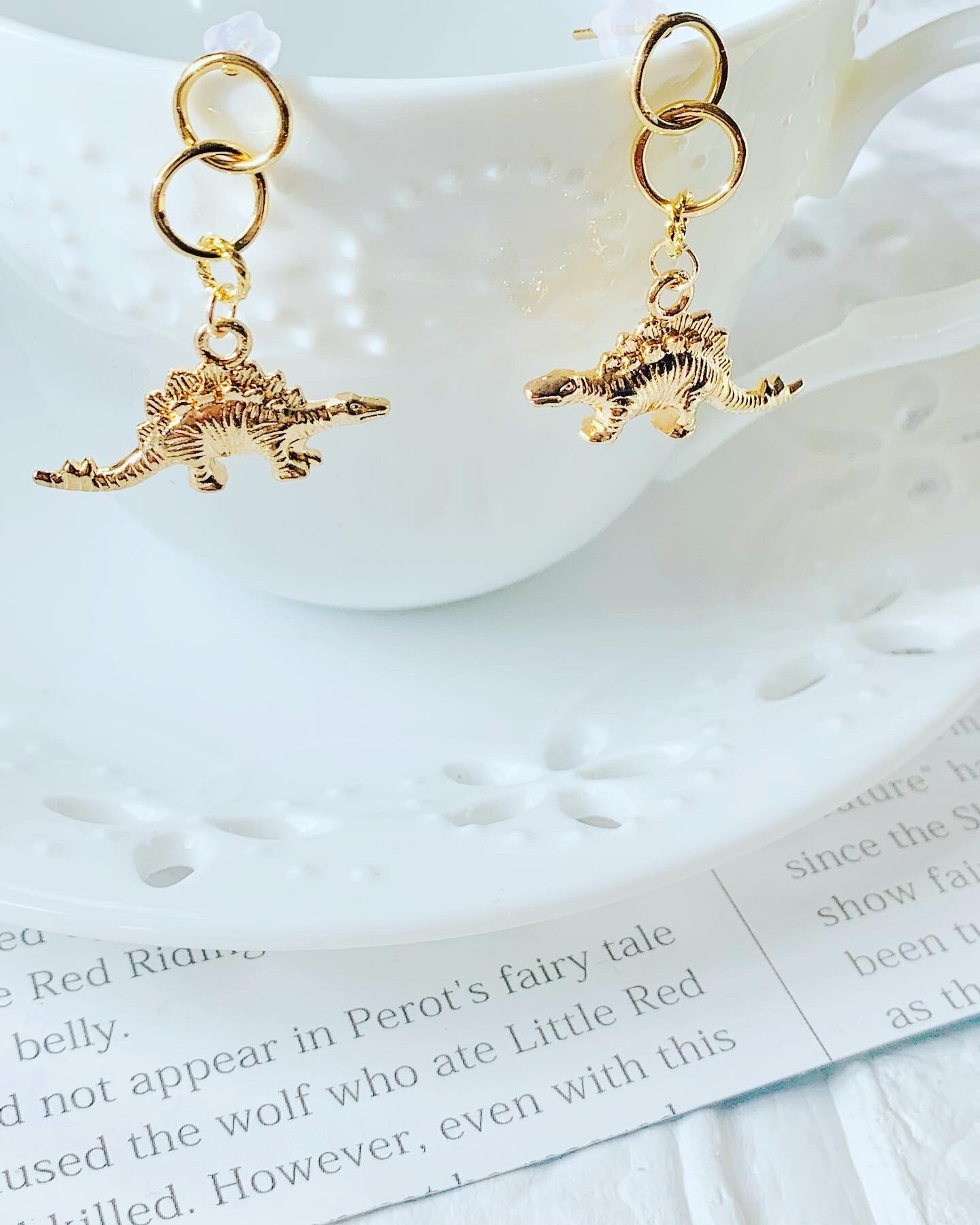 恐竜は立体的でどの角度から見ても可愛い!両面が同じデザインで、耳元で揺れると