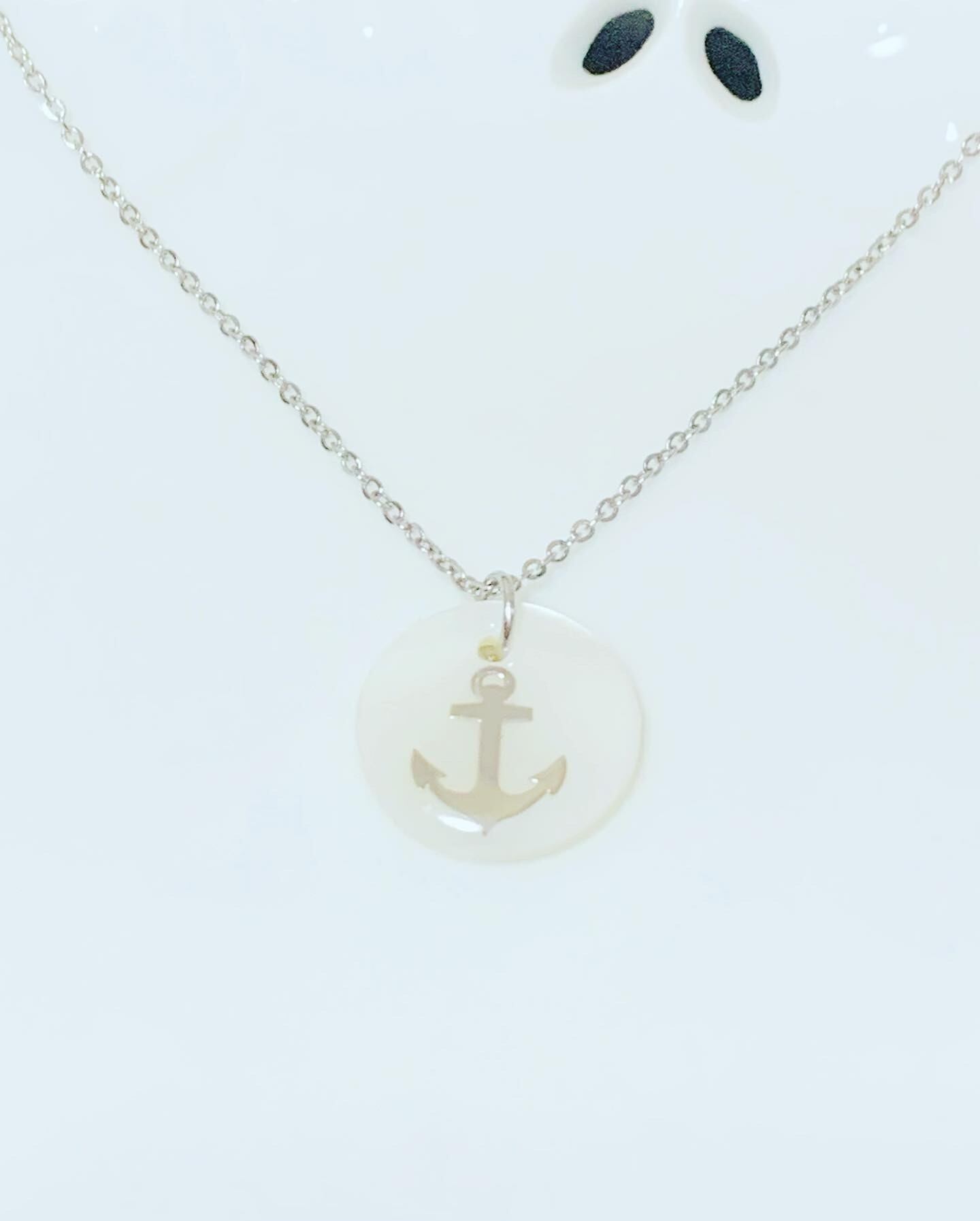 シェル(貝)プレートにイカリマークが付いた、シンプルなネックレス。