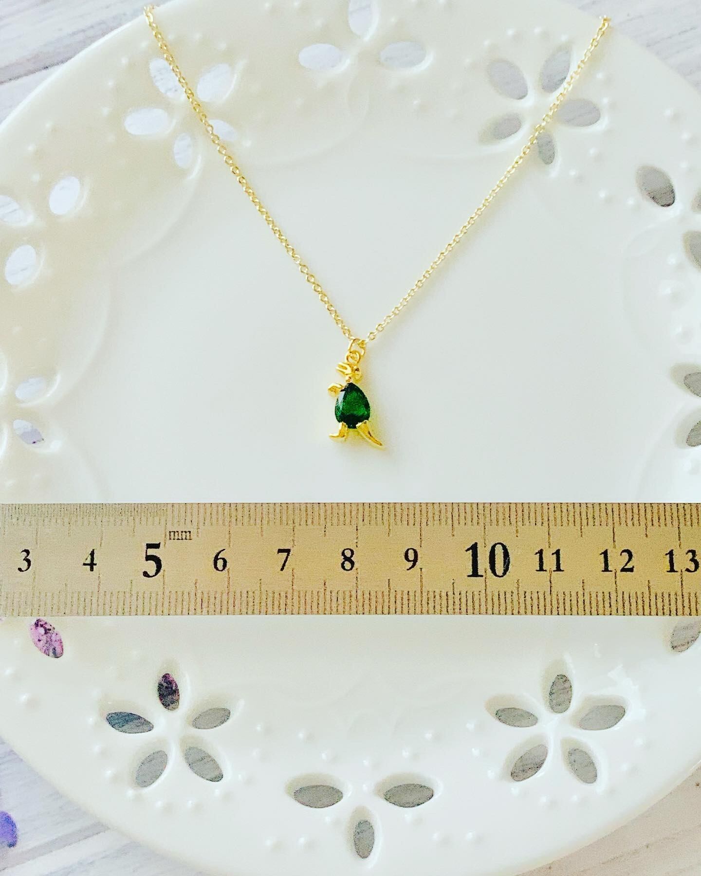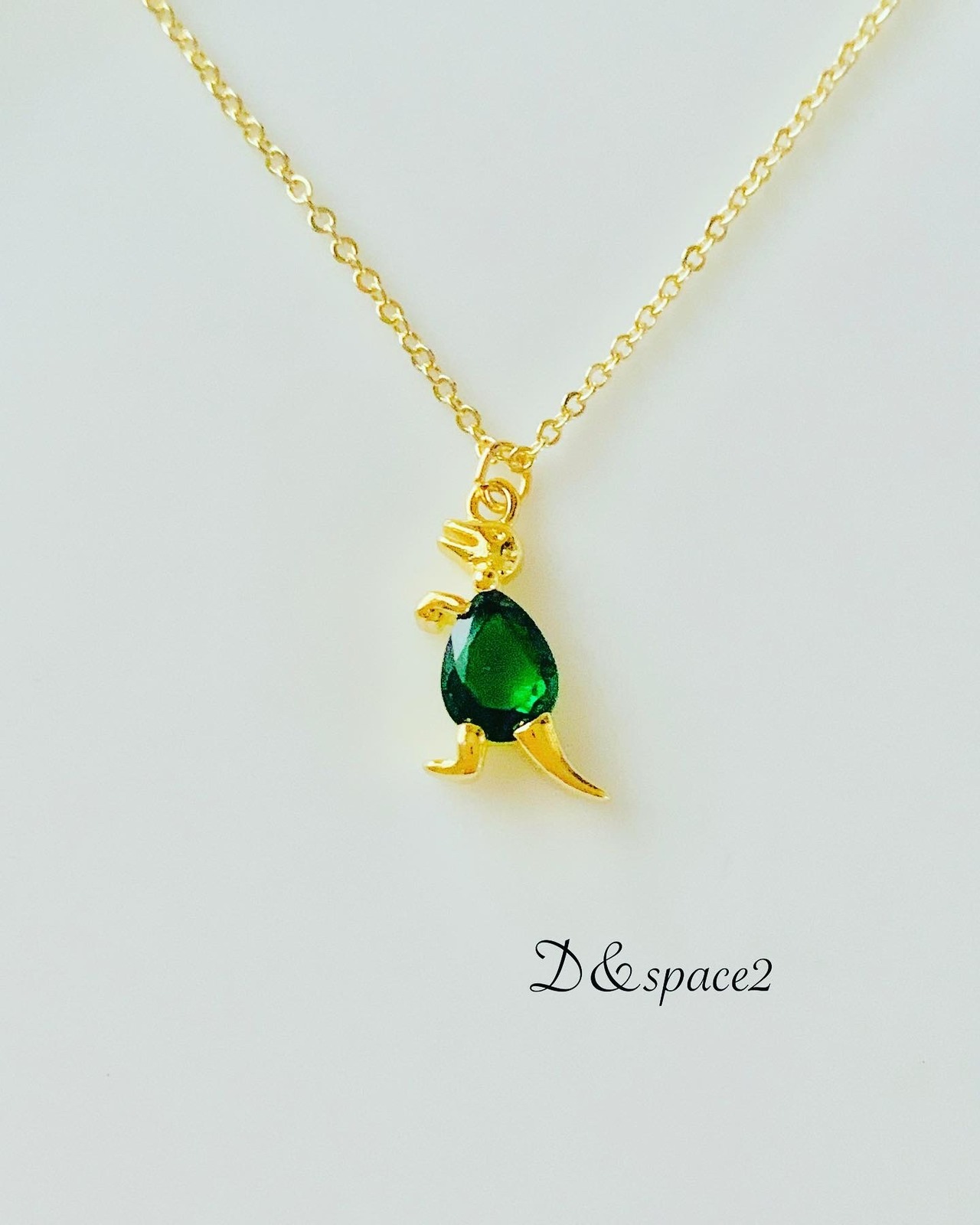 キュービックジルコニア付きの恐竜ネックレスです。チェーンのカラーはゴールド、ジルコニアのはグリーントルマリンカラー。