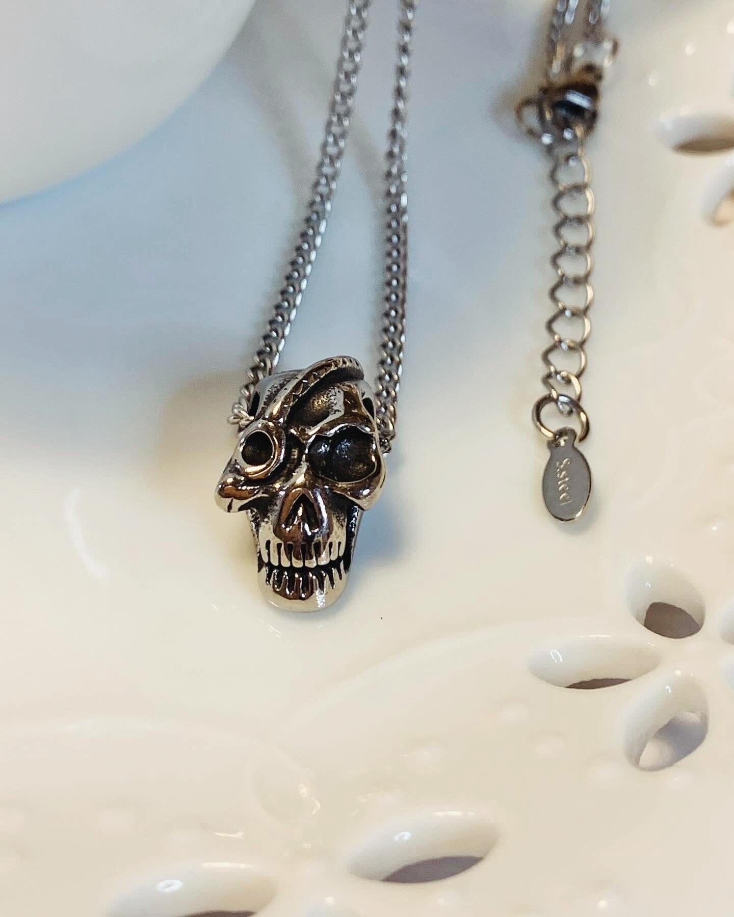 重厚感のあるステンレス製のスカルネックレス。洗練されたデザインとクールな雰囲気が首元を引き立てる、存在感たっぷりのアクセサリー。