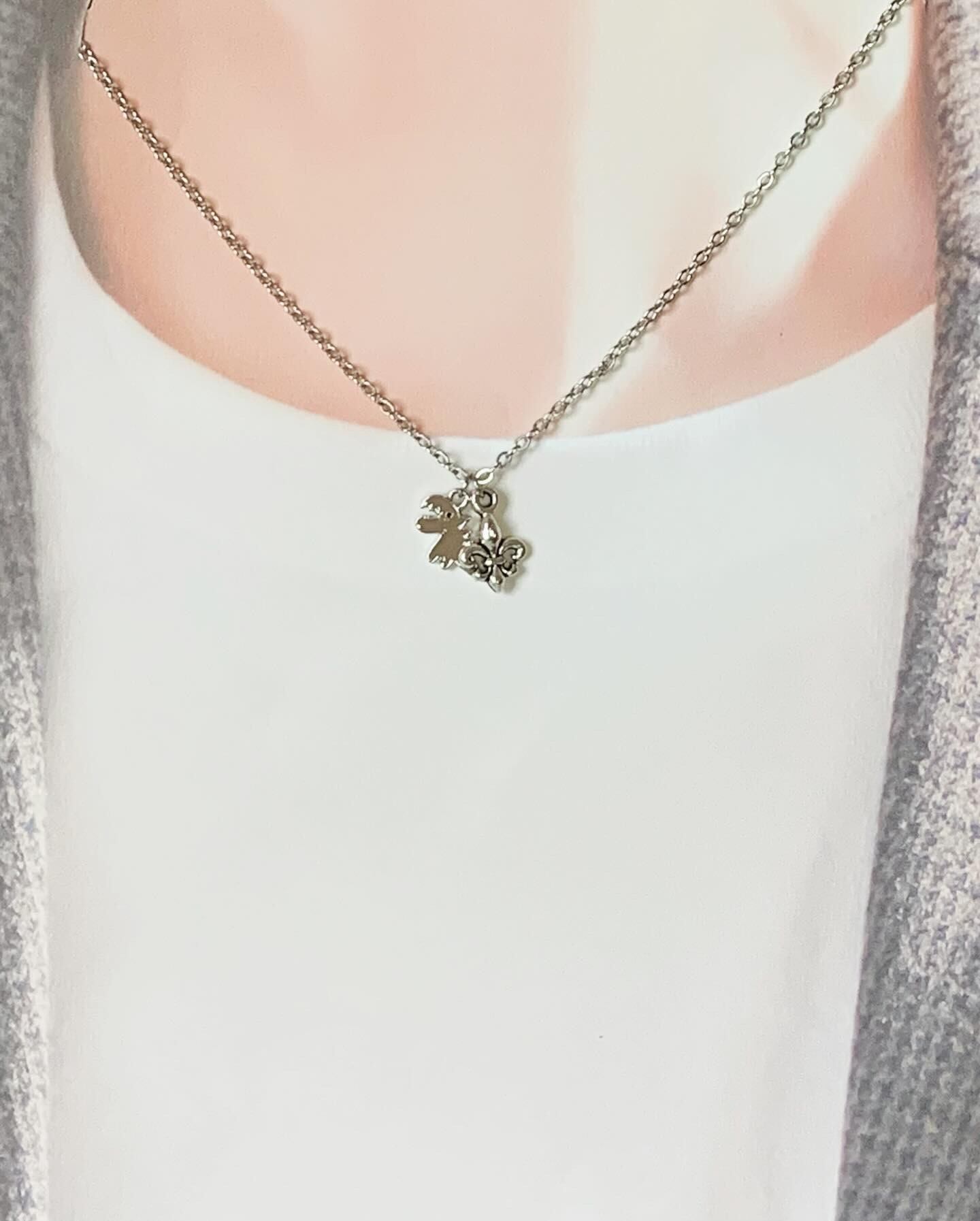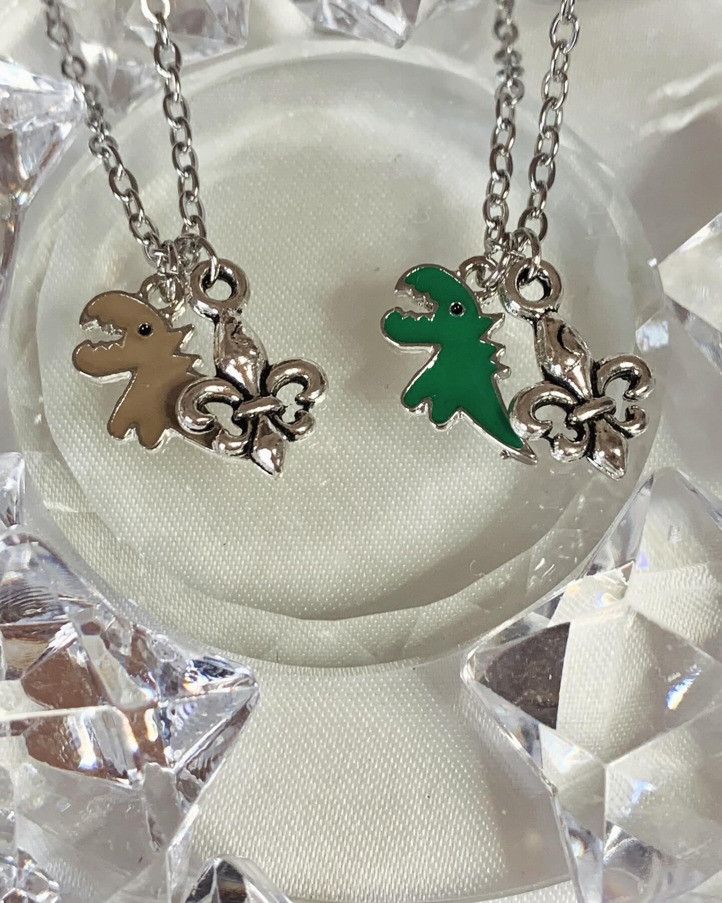カジュアルでユニークなデザインの恐竜と百合の紋章が融合したネックレス。異素材の組み合わせがカッコいい☆百合の紋章が大人っぽさを、恐竜モチーフが遊び心をプラスしてくれます。